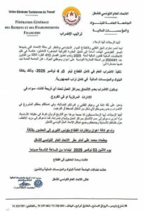 تنفذ الجامعة العامة للبنوك والمؤسسات المالية اضرابا عاما في كامل القطاع أيام 3.4نوفمبر 2025 بكافة المؤسسات البنكية للخدمات في كامل تراب الجمهورية وذلك حسب تراتيب الاضراب