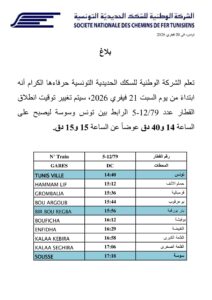 بداية من اليوم: تغيير توقيت انطلاق قطار تونس – سوسة Radio RM FM ساعتين مضت الأخبار, الجهويّة التعليقات على بداية من اليوم: تغيير توقيت انطلاق قطار تونس – سوسة مغلقة 73 زيارة مقالات مشابهة المنستير: الإدارة الجهوية للشؤون الإجتماعية ترصد مليون و192 ألف دينار لدعم العائلات المعوزة 25 دقيقة مضت مقترح قانون يقترح السجن المؤبد لمروجي المخدرات والمعتدين جنسيا على القصر 46 دقيقة مضت 12 شهيدا و24 جريحا حصيلة الغارات الصهيونية على شرقي لبنان وجنوبه 49 دقيقة مضت سيتم بداية من اليوم السبت 21 فيفري 2026، تغيير توقيت موعد انطلاق القطار عدد 12/79-5- الرابط بين تونس وسوسة ليصبح على الساعة 14 و40 دق عوضاً عن الساعة 15 و15 دق. وفي ما يلي تفاصيل مواعيد وصول القطار إلى مختلف المحطات: شاركها Facebook Twitter Stumbleupon LinkedIn Pinterest