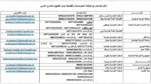 وللتواصل عند الضرورة، مع مختلف البعثات الدبلوماسية والقنصلية نشرت وزارة الشؤون الخارجية عناوين البريد الالكتروني أو أرقام الهاتف (واتساب) التالية: