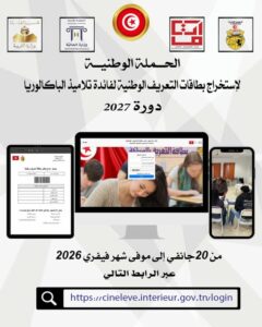 تنطلق الحملة الوطنيّة لإستخراج بطاقات التعريف الوطنيّة لفائدة تلاميذ الباكالوريا دورة 2027 من 20 جانفي إلى مُوفى شهر فيفري 2026 باستخدام منصّة رقميّة نمُوذجيّة تعتمدُ آليّة الترابط البيني بهدف تقريب الخدمة من التلاميذ وتحسين جودتها وتقليص الوثائق الإداريّة.