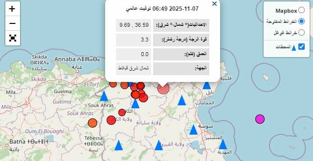 سجلـت محطـات رصـد الزالزل التابعـة للمعـهـد الوطنـي للرصـد الجوي رجة أرضية، اليوم الجمعة 7 نوفمبر ،2025 علـى الساعــة 07 و 49 دقيقة (بالتوقيت المحلي)، بلغت قوتهـا 3 فاصل 3 درجة علـى سلـم ريشتـر.