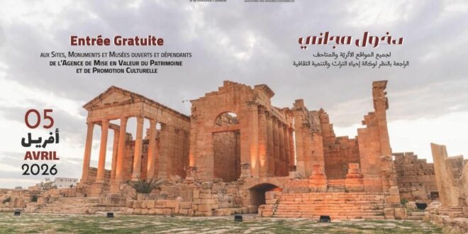 أفادت وكالة إحياء التّراث والتّنمية الثّقافية أنّ الدخول لجميع المواقع الأثريّة والمعالم التاريخيّة والمتاحف المفتوحة والراجعة بالنظر لوكالة إحياء التراث والتنمية الثقافية المضمّنة بالقائمة المصاحبة سيكون بصفة مجانية يوم الأحد 05 أفريل 2026 .