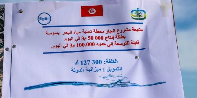 جدير بالذكر أن نسبة تقدم أشغال محطة تحلية المياه بسوسة، التي يتواصل إنجازها بكلفة 128 مليون دينار، بلغت خلال شهر أفريل المنقضي نسة 90 %، وتبلغ طاقة استيعابها القصوى 50 الف م3 في اليوم قابلة للتوسيع إلى 100 ألف م3 في اليوم في مرحلة لاحقة.