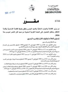 وزارة الفلاحة تضبط قائمة وحدات صيد التن الأحمر لموسم 2026 Radio RM FM ساعتين مضت الأخبار, الوطنيّة التعليقات على وزارة الفلاحة تضبط قائمة وحدات صيد التن الأحمر لموسم 2026 مغلقة 81 زيارة مقالات مشابهة الرابطة المحترفة الثانية: حكام مباريات الجولة الـ22 ساعتين مضت إيران تعلن فتح مضيق هرمز بالكامل ساعتين مضت إتحاد الشغل يطالب بالزيادة في الأجور وفي جرايات المتقاعدين 3 ساعات مضت أصدرت وزارة الفلاحة والموارد المائية والصيد البحري الجمعة 17 أفريل 2026، المقرر المتعلق بضبط القائمة الأساسية وقائمة الانتظار ومقابل الحصول على الحصة الفردية السنوية من صيد التن الاحمر لموسم سنة 2026. شاركها Facebook Twitter Stumbleupon LinkedIn Pinterest
